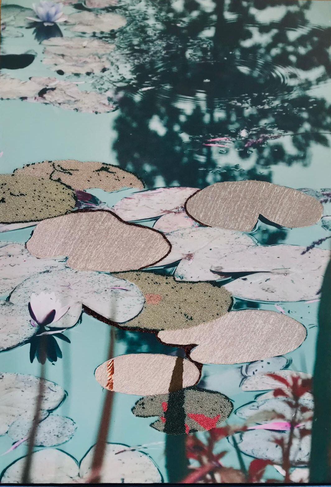 綿密に刺繍が施されている蓮とプリントのままの葉の明暗がマティゴの独特の手法です。